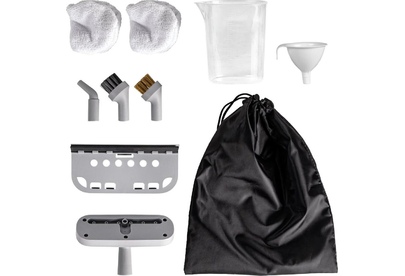 подробная комплектация: 5 насадок (насадка для чистки стекол, насадка для отпаривания, нейлоновая щетка, медная щетка, щелевая насадка), тряпка - 2 шт, коннектор для подсоединения насадок, воронка для наполнения бойлера водой, мешок для хранения аксе