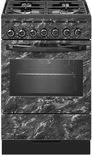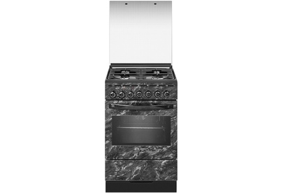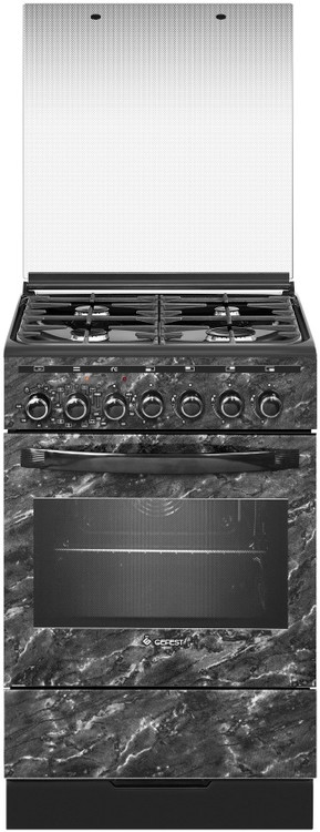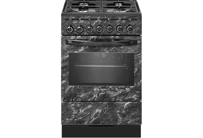 Газоэлектрическая плита с шириной 50 см, поставляется с защитной крышкой. Фасад - стеклянный, в черном цвете с нанесенным рисунком текстуры мрамора. В нижней части плиты есть выдвижной ящик для хранения. Варочная поверхность - эмалированная, все газовые конфорки с электроподжигом (встроен в поворотные ручки управления) и газ-контролем. Составные чугунные решетки - прочные и просты в очистке.