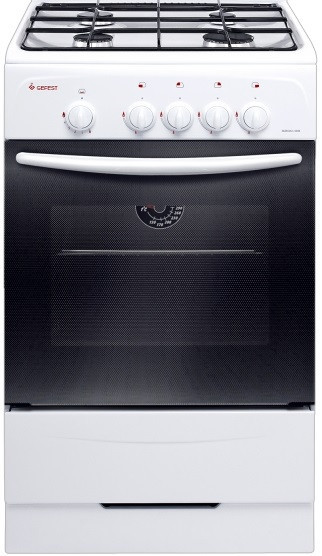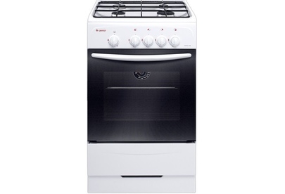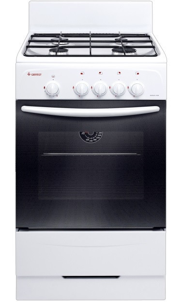 Газовая плита белого цвета с защитным щитком, ширина 50 см. Эмалью покрыты как фасад, так и варочная поверхность с 4 конфорками. Все конфорки оснащены системой газ-контроля, духовка с полезным объемом в 42 литра укомплектована термоуказателем нагрева. Бытовой прибор исполнен в классическом дизайне, управление осуществляется с помощью поворотных ручек. Конфорки имеют различный диаметр и мощность, есть маленькая, экономичная. Предусмотрен ящик для хранения посуды.Ключевые преимущества: