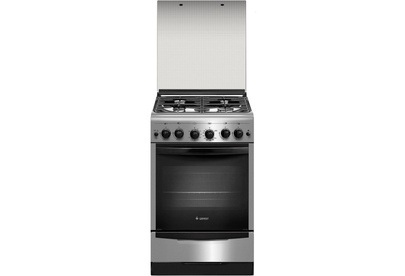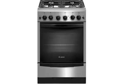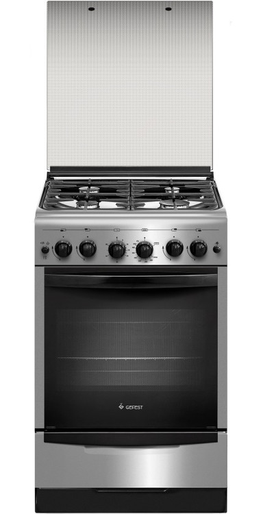 Элегантная газовая плита в стиле хай-тек, ширина 50 см. Фасад и рабочая поверхность модели покрыты нержавеющей сталью, поворотные ручки-черные. Конфорки рабочего стола выполнены с различным размером и мощностью, защищены составными чугунными решетками и стеклянной крышкой. На панели управления установлен таймер. Все горелки с электроподжигом.