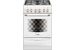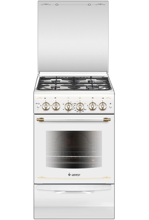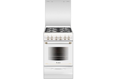 Белая газовая плита шириной 50 см, фасад покрыт эмалью, элементы декора выполнены в ретро-дизайне. Хорошее решение для кухни в кантри-стиле.