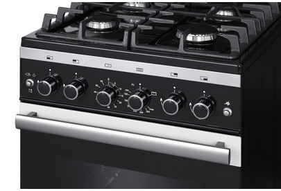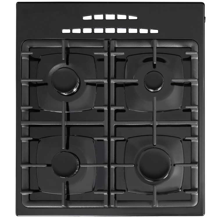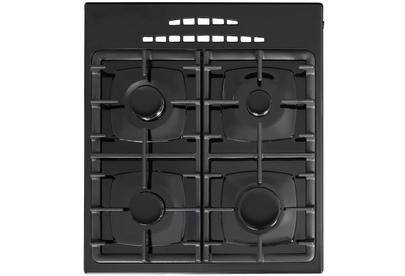 Газовая плита шириной 50 см, фасад - стеклянный, декорирован накладками из нержавеющей стали. Варочная поверхность также стеклянная, с чугунными решетками. Горелки обеспечены электроподжигом, включение обеспечивается нажатием кнопки на панели. Плита обеспечена механическим таймером, окончание заданного времени означается звуковым сигналом. Две стандартные конфорки дополнены большой и малой, с экономичным горением.