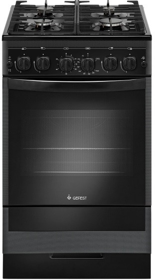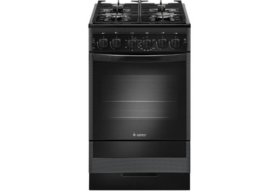 Черного цвета газовая плита, шириной 50 см, поставляется без защитной крышки. Фасад декорирован стеклянными накладками на панели управления и выдвижном ящике для хранения посуды.
