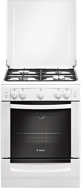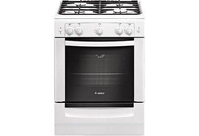 Белая эмалированная газовая плита шириной 60 см. Модель поставляется с защитной крышкой стола и выдвижным ящиком для хранения. Все газовые горелки оснащены газ-контролем, верхние конфорки с электроподжигом (кнопка на панели управления) и защищены чугунными решетками. Духовка (52 л.) с подсветкой и термоуказателем на дверце.