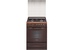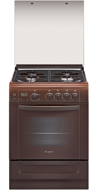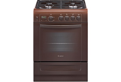 Коричневая газовая плита с выдвижным ящиком и стеклянной защитной крышкой, ширина 60 см. Профильные чугунные решетки на эмалированной варочной поверхности дополнены стеклянной защитной крышкой, на панели управления установлен электронный таймер со звуковым сигналом об окончании заданного времени. Плита оснащена автоматическим электроподжигом и газ-контролем горелок рабочего стола и жарочного шкафа.
