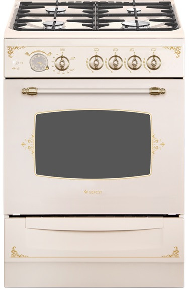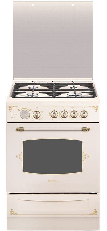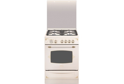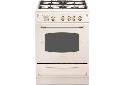 Газовая плита кремового цвета, с декором и рисунком "ретро", ширина 60 см. Такая модель притягивает взгляд и отлично вписывается в интерьер, установленная на кухне. Профильные чугунные решетки на эмалированной варочной поверхности дополнены стеклянной защитной крышкой, на панели управления - таймер, выполнен в виде аналоговых часов, при окончании программы звучит сигнал. Плита оснащена автоматическим электроподжигом и газ-контролем горелок рабочего стола и жарочного шкафа. В комплектации поставляется и выдвижной ящик, удобный для хранения посуды и противней.