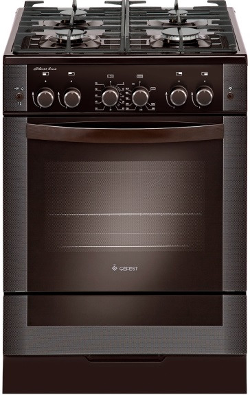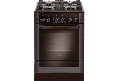 Коричневая газовая плита шириной 60 см. Классический дизайн бытового прибора дополнен стеклянным фасадом, на кухне модель несомненно будет привлекать взгляд. Уход не доставляет особенных проблем, конфорки защищены чугунными решетками, в духовке газовая горелка оснащена газ-контролем. Кнопка на панели управления - электроподжиг, нет нужды вручную поджигать горелку. Для удобства эксплуатации в комплектацию входит таймер, по окончании времени приготовления раздастся звуковой сигнал.