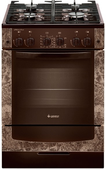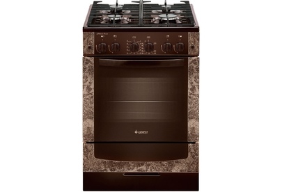 Коричневая газовая плита шириной 60 см, с рисунком-имитацией "мрамор" и стеклянными фасадом и рабочей поверхностью. Внешне смотрится бытовой прибор очень привлекательно, классический дизайн дополнен хорошим техническим оснащением. На панели управления, помимо поворотных ручек управления газовыми горелками, установлен механический таймер со звуковым сигналом. Горелки с электроподжигом, розжиг осуществляется нажатием кнопки.