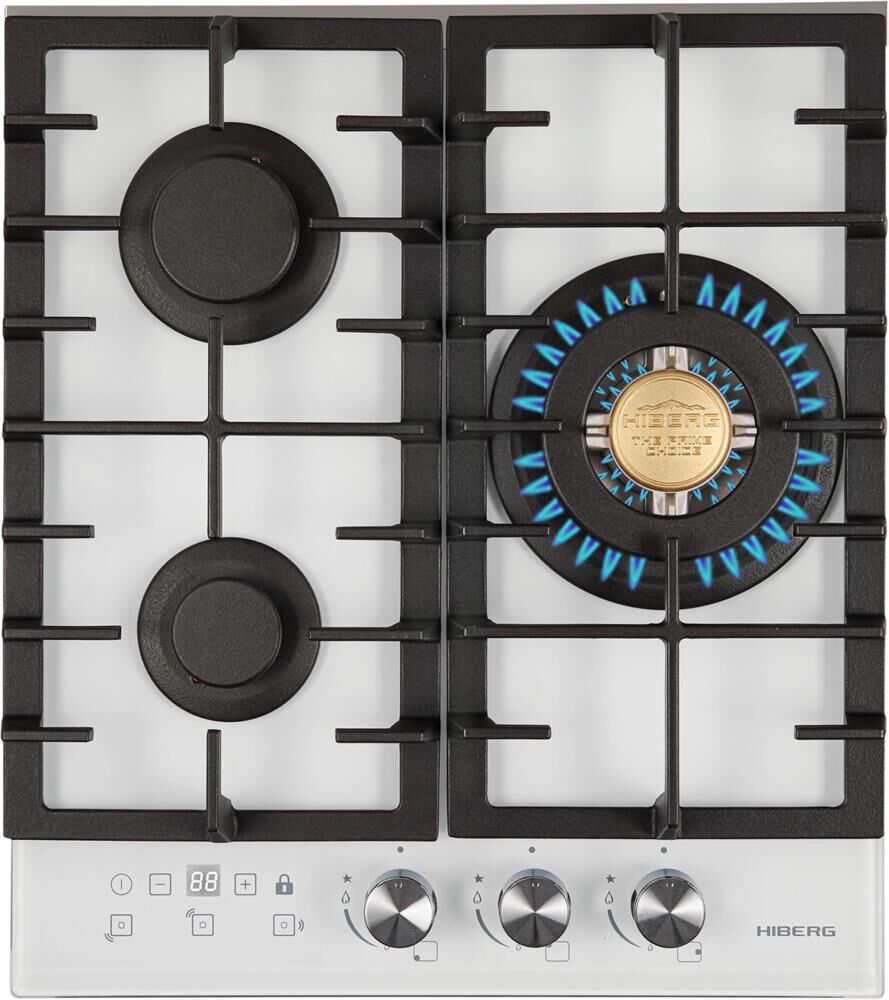 ШхГхВ: 45х51х10 см, Электроподжиг, Газконтроль, Сенсорный таймер отключения газа индивидуальный для каждой конфорки, Чугунная решетка, WOK конфорка, Поверхность: белое закаленное стекло, 2 комплекта ручек: серебристые, ретро