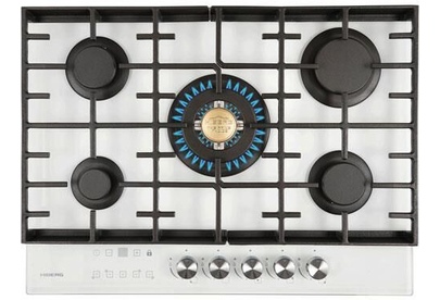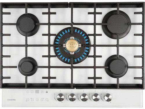 Встраиваемая газовая варочная поверхность HIBERG VM 7155 W из закаленного стекла в белом цвете, оснащена 5 конфорками и функциями: автоматический «электророзжиг», «газ-контроль» и сенсорный таймер отключения. В комплект варочной поверхности входит дополнительный набор ручек регуляторов в ретро-стиле. Рабочая поверхность выполнена из закаленного стекла - прочного и долговечного материала, на ней располагаются 5 конфорок разных по диаметру и мощности огня. WOK конфорка мощностью 3,4 кВт позволяет ускорить закипание воды и использовать интенсивную скорость прожарки. Мощность любой горелки можно регулировать с помощью поворотных переключателей. Для удобства пользования варочной панелью в переключатели встроен «электророзжиг», который позволит одним нажатием руки легко включить нужную конфорку без использования спичек. В варочной поверхности эффективно продумана система безопасности при утечке газа. В случае пролива жидкости на варочную панель или затухания пламени от сквозняка, в конфорке срабатывает функция газ-