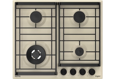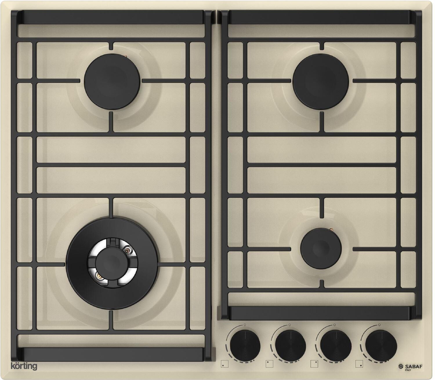 Газовая варочная панель, ширина 60 см, 4 высокоэффективные полностью черные конфорки SABAF (Италия), Общая мощность – 8,5 кВт, Сверхмощная конфорка WOK, 4 кВт, Поворотные регуляторы черного цвета, Газ-контроль, Электроподжиг, Чугунные держатели для посуды Цвет: бежевый