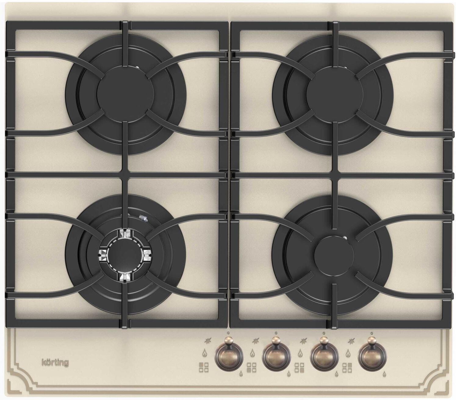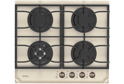 Газовая варочная панель из закаленного стекла 60 см, закаленное стекло, 4 высокоэффективные конфорки, WOK-сверхмощная конфорка с тройным рядом пламени, автоматический электроподжиг, газ-контроль каждой конфорки, переднее расположение поворотных регуляторов, цельные чугунные решетки, в комплекте - подставка WOK, цвет - бежевое стекло, цвет регуляторов - бронза
