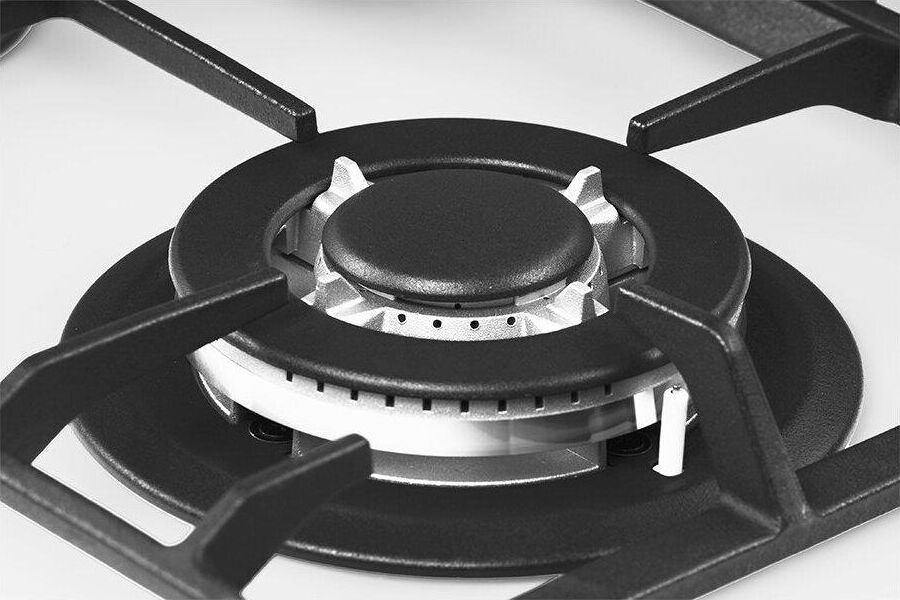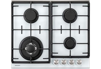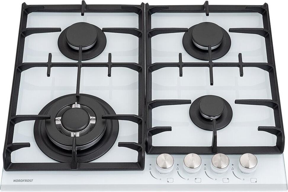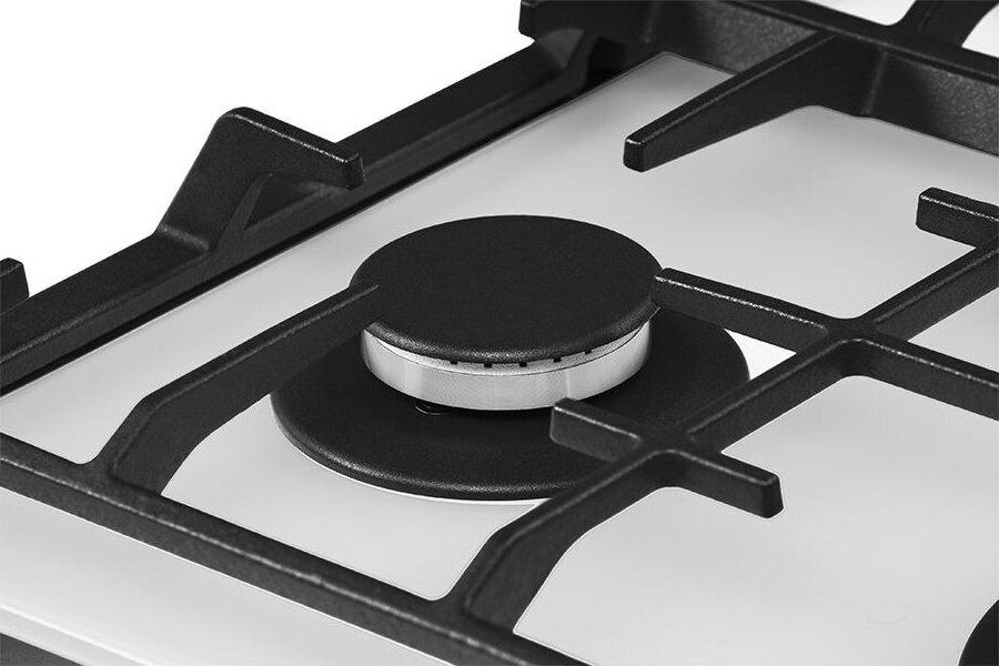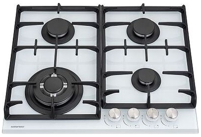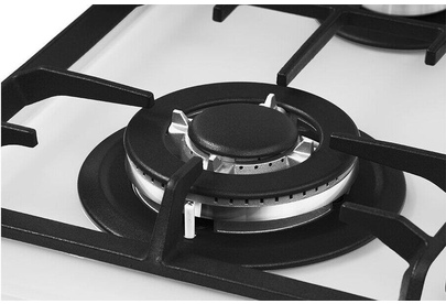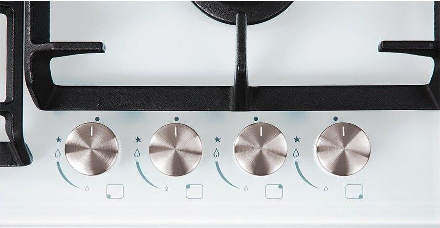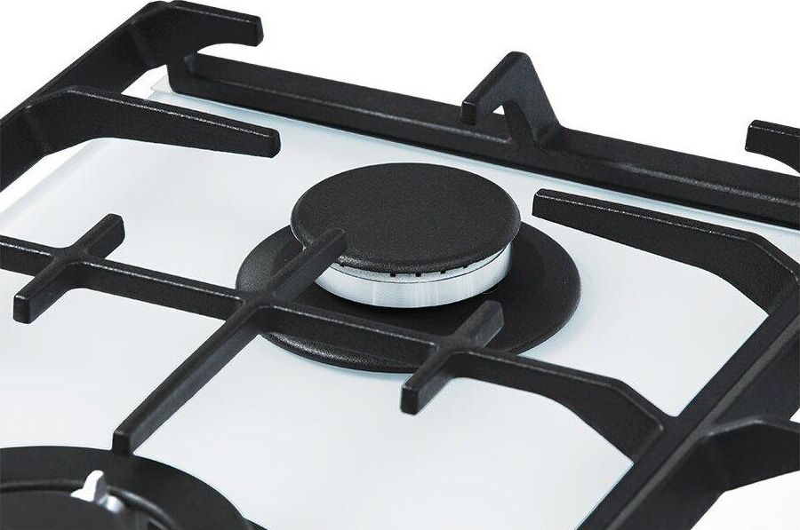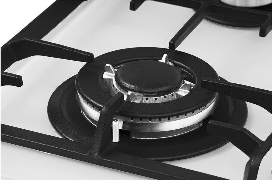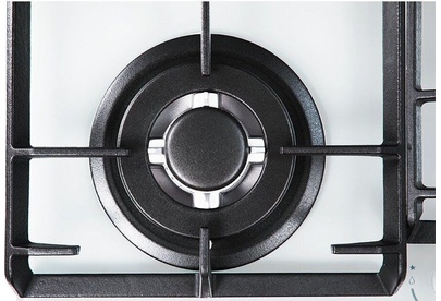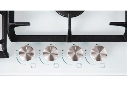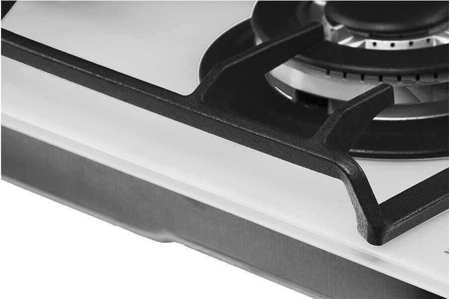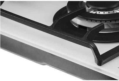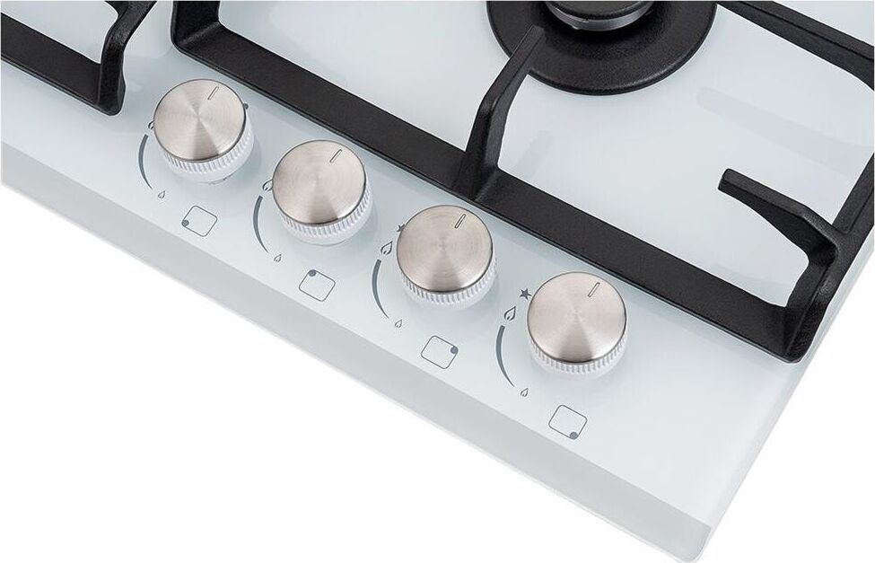 ШхГхВ: 58,4х51х10 см; электроподжиг; решетка: чугунная; WOK конфорка; цвет поверхности: белое закаленное стекло; цвет ручек: серебристые