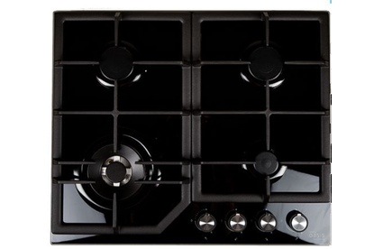 Размеры 61х51х9,7см.Закаленное стекло, черный, чугунная решетка, автоматический розжиг, газ-контроль, 4 газовые конфорки, WOK-конфорка, ширина варочной поверхности 60см, Турция