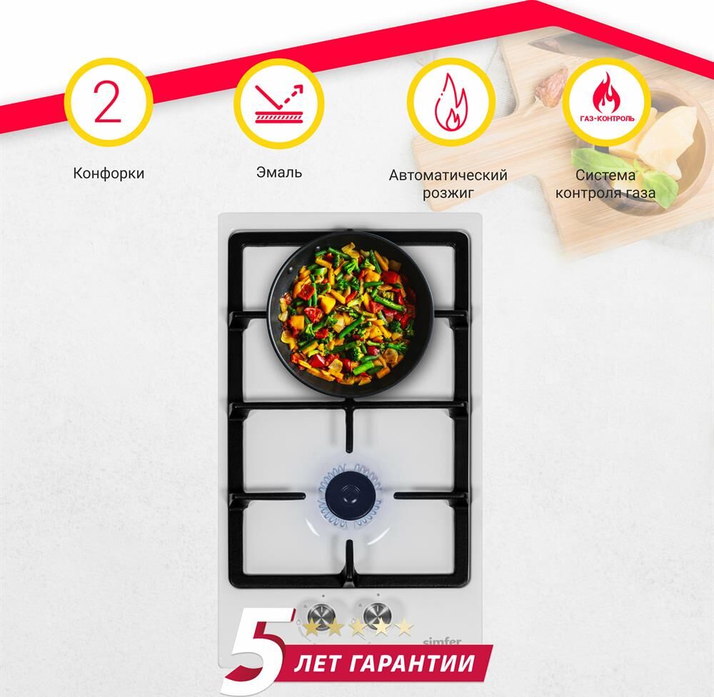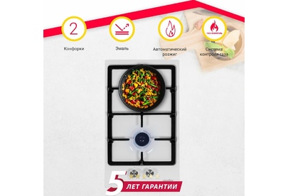 • Независимая газовая варочная поверхность 30 см. • Кол-во конфорок – 2 1 х конфорка повышенной мощности 3000 Вт. 1 x экономичная конфорка 1000 Вт. • Автоматический розжиг • Газ контроль • Фронтальная панель управления • Комплектация: цельная чугунная решётка, жиклёры для баллонного газа • Цвет – белый