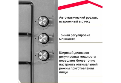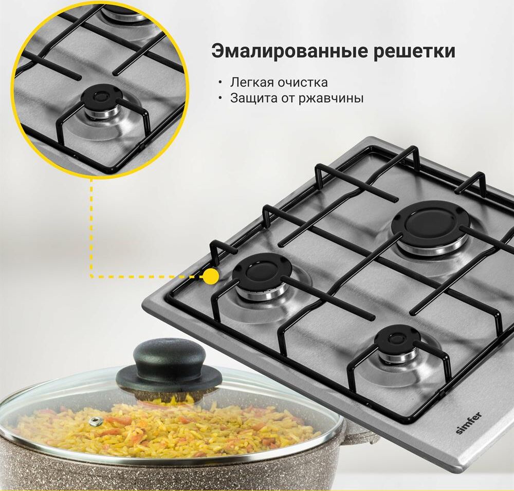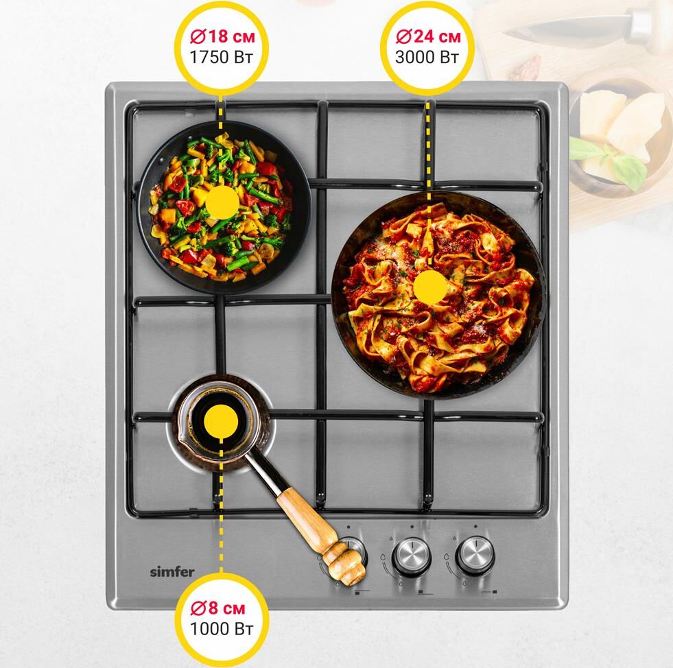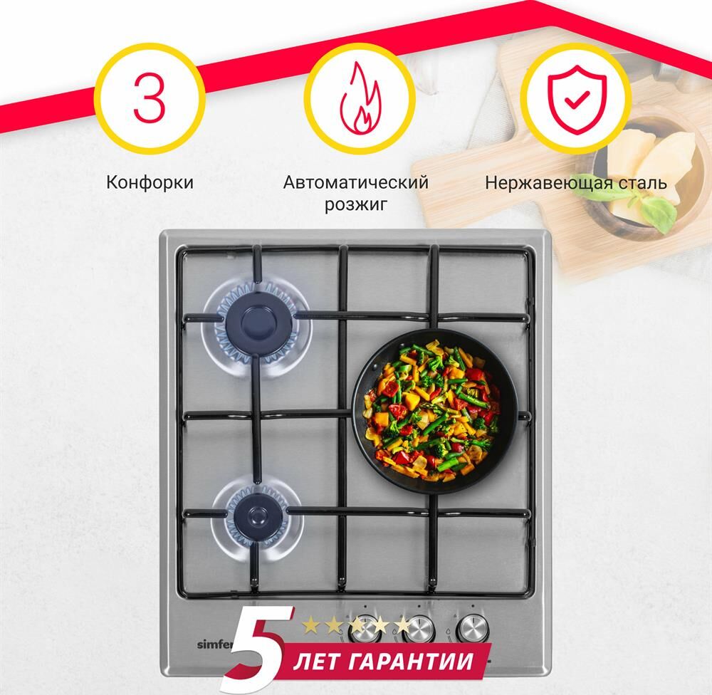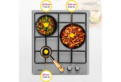 Газовая варочная панель 45см Simfer H45V30M470 это стильное и функциональное решение для вашей кухни. Панель оснащена тремя конфорками различных размеров и мощностей, позволяя вам выбирать оптимальный режим приготовления для различных блюд. С помощью автоматического розжига вы сможете легко и безопасно зажечь плиту. Эмалированные решетки обеспечивают устойчивость посуды и удобное размещение кастрюль и сковород. • Независимая газовая варочная поверхность 45 см.