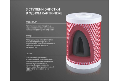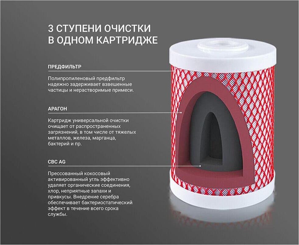 Картридж Арагон 3 ЭКО – композитный картридж с тремя стадиями очистки: механическая, ионообменная и сорбционная. Состоит из предфильтра, материала Арагон и карбон-блока. В картридже Арагон 3 ЭКО применена особая уникальная технология Monocondensing для монодисперсного распределения пор полимера,... Температура очищаемой воды 4°С -95°С Производительность до 3,6 л/мин Ресурс до 12000 литров Типоразмеры (высота/диаметр), мм 170/115 (нестандартный размер)