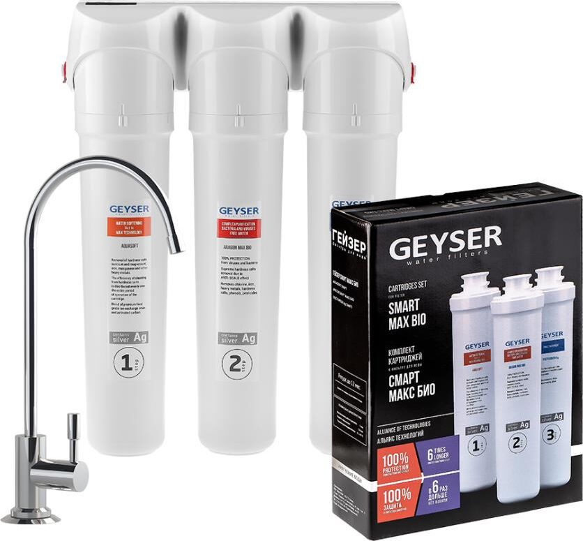Фильтр для воды Гейзер Смарт Макс Био последняя разработка компании Гейзер, сочетающая в себе уникальную технологию непрерывного умягчения воды и гарантированную защиту от вирусов и бактерий. Фильтр эффективно очищает воду от хлора, железа, тяжелых металлов, солей жесткости, пестицидов и надолго защищает вашу технику от образования накипи. Гейзер Смарт Макс Био состоит из уникального материала Арагон Био, который удаляет 100 % вирусов и бактерий из воды. Комплект картриджей Гейзер Смарт Макс БИО разработан для комплексной очистки воды и предотвращения образования накипи. ресурс картриджей до 10000 л. или до 12 мес; температура очищаемой воды от 4 до 40 °С; используемая вода для фильтрации, водопроводная; тип воды, ж сткая; рекомендуемая жесткость воды от 4 до 7 Ж°; удаление железа до 1 мг, перманганатной окисляемости (органики) до 5 мгО2/л; рекомендуемая скорость фильтрации от 1,5 до 2 л/мин; рабочее давление от 0,5 до 7 атм;