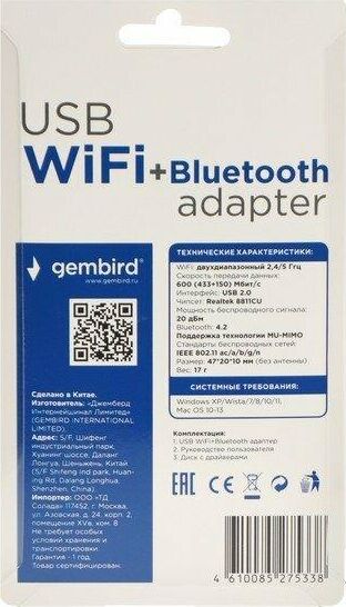 WNP-UA-019 Технические характеристики: WiFi: двухдиапазонный 2,4/5 Ггц Скорость передачи данных: 600 (433+150) Мбит/с Интерфейс: USB 2.0 Чипсет: Realtek 8821CU Мощность беспроводного сигнала: 20 дБм Bluetooth: 4.2 Стандарты беспроводных сетей: