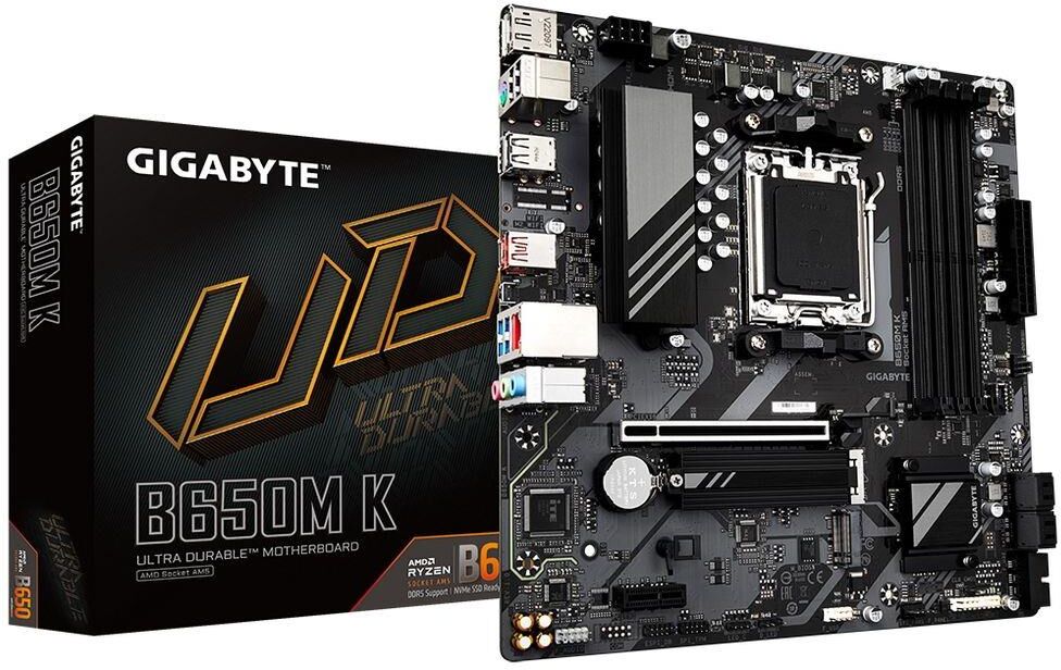**Материнская плата Gigabyte B650M K, RTL** — это надёжное и функциональное решение для сборки современного ПК. Она поддерживает процессоры от AMD и предлагает широкий спектр возможностей для эффективной работы и игр. **Основные характеристики:** * Форм-фактор: Micro-ATX. * Чипсет: AMD B650. * Поддержка процессоров: AMD Ryzen (AM5). * Слоты для памяти: 4 DIMM, поддержка до 128 ГБ DDR5. * Слоты для расширения: PCIe 4.0 x16, PCIe 3.0 x1 и другие. * Разъёмы для накопителей: несколько портов SATA и M.2. * Аудио: Realtek HD Audio. * Сетевые возможности: гигабитный сетевой контроллер. * Порты USB: USB 3.2 Gen 2, USB 2.0 и другие. **Преимущества:** * Высокое качество компонентов и сборки. * Хорошая совместимость с современными комплектующими. * Наличие всех необходимых разъёмов для подключения периферийных устройств. * Поддержка последних стандартов памяти и накопителей. Материнская плата Gigabyte B650M K, RTL — отличный выбор для тех, кто хочет собрать мощный и надёжный компьютер для работы, игр или других задач.