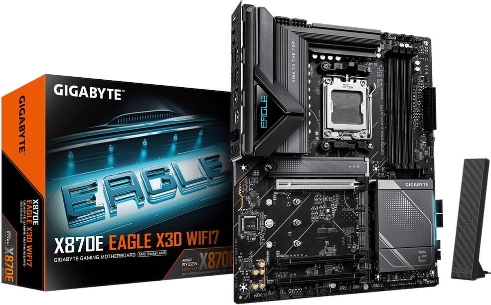 **Материнская плата Gigabyte X870E EAGLE X3D WIFI7** — идеальное решение для сборки мощного настольного ПК! **Почему стоит выбрать эту материнскую плату?** * **Совместимость с процессорами AM5:** разъём для процессора AM5 позволяет использовать современные процессоры. * **Расширенные возможности для хранения данных:** 4 слота M.2 и 4 разъёма SATA 6 Гб/с дают возможность создать гибкую и масштабируемую систему хранения. * **Поддержка скоростной памяти DDR5:** 4 слота для памяти DDR5 с минимальной частотой 4400 МГц и возможностью разгона до 9000 МГц обеспечивают высокую производительность. * **Множество интерфейсов для подключения устройств:** * 3 слота PCI-E x16 для видеокарт и других устройств; * порты USB 3.2 Gen2, USB 3.2 Gen1, USB 2.0 для подключения периферийных устройств; * разъёмы Type-C (DP) и HDMI для подключения мониторов. * **Современные сетевые возможности:** встроенный модуль Wi-Fi 7 и поддержка 5G обеспечивают быстрое и стабильное подключение к сети. * **Форм-фактор ATX:** универсальная совместим