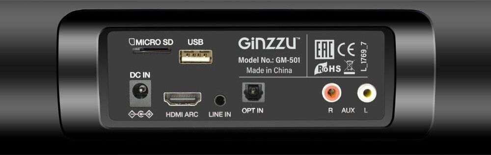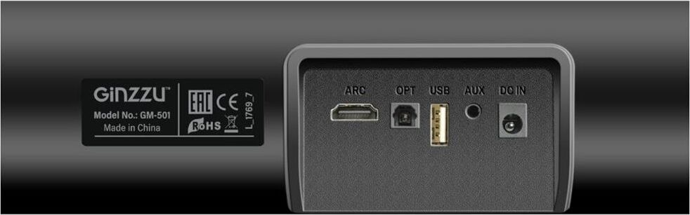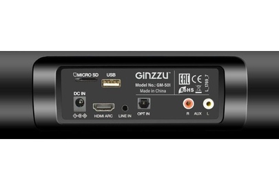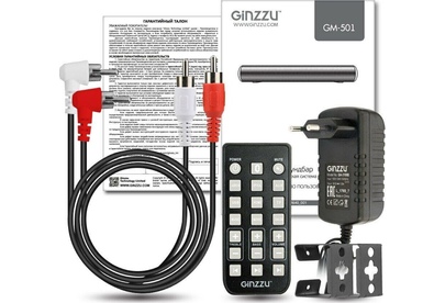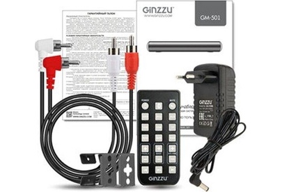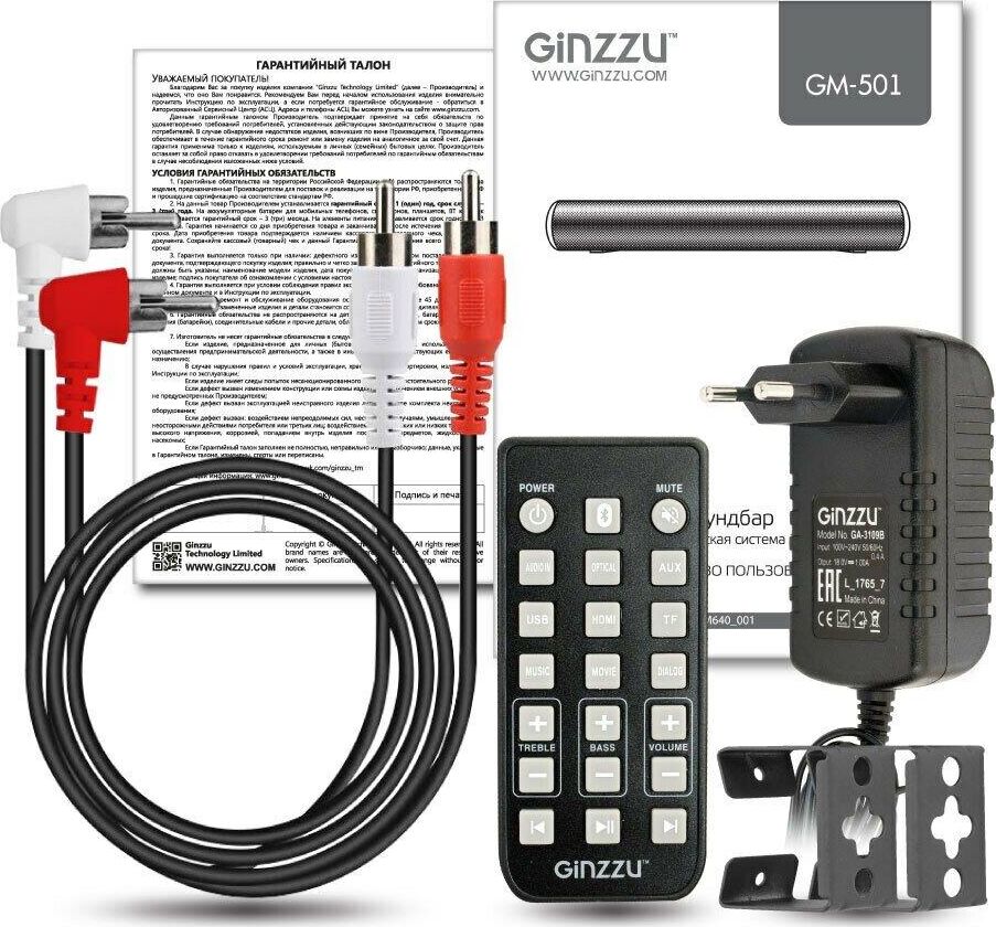 саундбар Ginzzu GM-501, адаптер питания GA-3109B, аудиокабель DC-jack3.5mm x 2RCA, пульт ДУ, комплект для крепежа на стену, документация