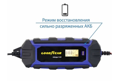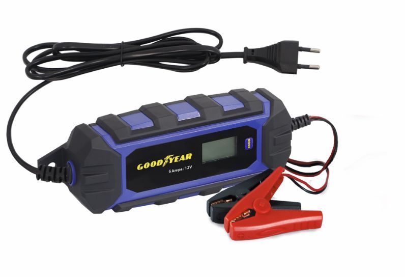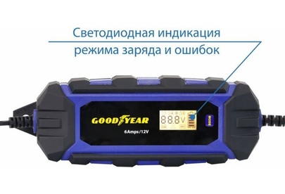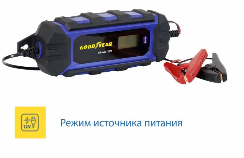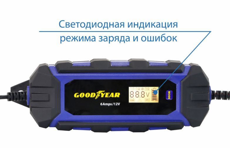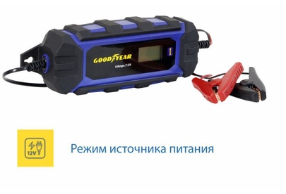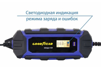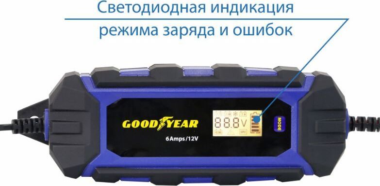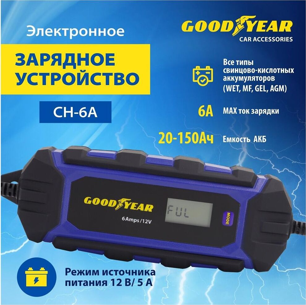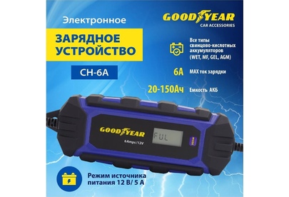 Электронное зарядное устройство Goodyear Smart для аккумулятора, модель CH-6A. Применяется для заряда всех типов свинцово-кислотных автомобильных аккумуляторов WET, MF, GEL, AGM. Напряжение электросети 220-240В (50Гц) Цвет корпуса Синий, черный