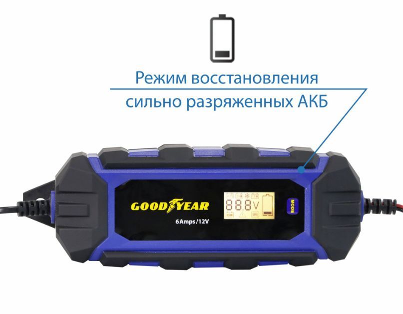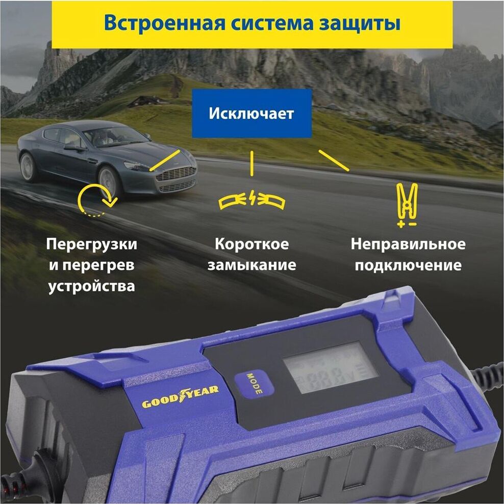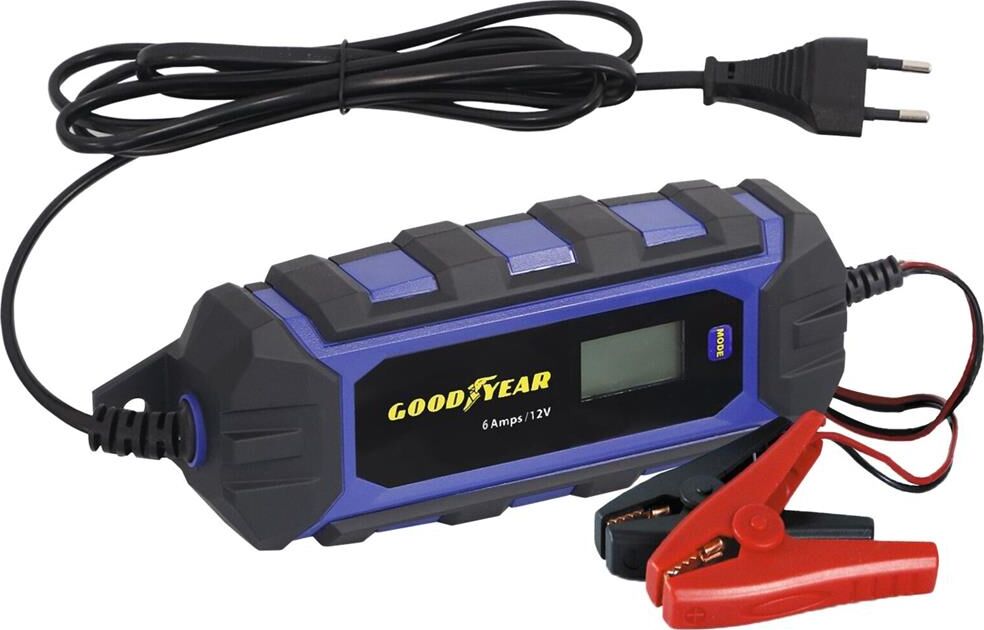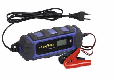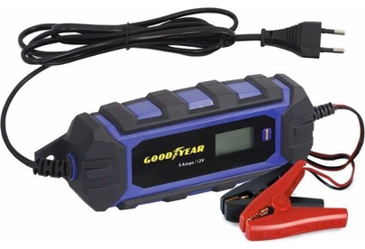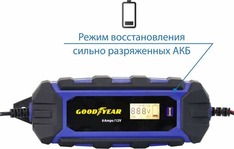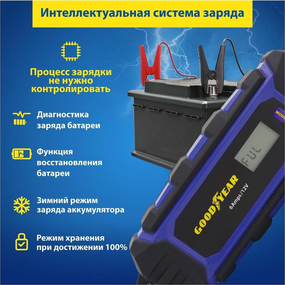 Электронное зарядное устройство Goodyear Smart для аккумулятора, модель CH-6A. Применяется для заряда всех типов свинцово-кислотных автомобильных аккумуляторов WET, MF, GEL, AGM. Напряжение электросети 220-240В (50Гц) Цвет корпуса Синий, черный
