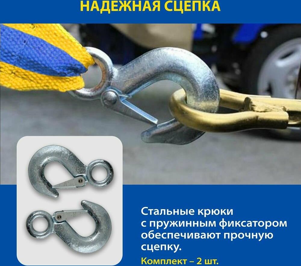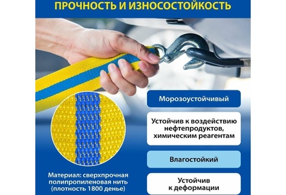 Трос буксировочный Goodyear 10 тонн, 5 метров, 2 стальных крюка, водостойкий, сумка в комплекте. Буксировочный трос 10 тонн Goodyear GY004003 обладает высокой прочностью. Изделие выполнено в сине-желтом цвете. В комплекте поставляется сумка для транспортировки. Материал полностью выдерживает воздействие различных погодных условий, в том числе мороза. Ширина ленты составляет 60 мм. Крюки выполнены из прочной стали. Технические характеристики троса Goodyear GY004003 Тип трос Вид ленточный (плоский) Max нагрузка, т 10 Крепление крюк Длина, м 5 В чехле да Материал полипропилен Тип по нагрузке буксировочный
