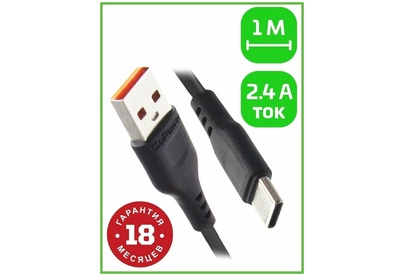 "Тип: Type-C Длина: 1 м Поверхность разъема: ПВХ, двухстороннее литье под давлением Разъем: два концевых медных штифта с позолотой, 24-часовой тест солевым туманом Максимальный ток: 2,4 А "