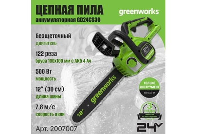 GREENWORKS Цепная пила GD24CS30 аккум. дл.шины:12" (30cm) (2007007)