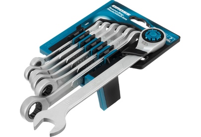 Набор комбинированных трещоточных ключей Gross 14859 включает в себя 7 инструментов из стали CrV и используется для монтажа и демонтажа резьбовых соединений диаметром от 8 до 19 мм. Ключи имеют как рожковую, так и накидную часть, что повышает их функциональность. У накидной части 12 внутренних граней, что увеличивает площадь соприкосновения с головкой крепежа и снижает риск ее деформации. Ключи применяются как в автосервисах, так и для самостоятельного ремонта автомобилей. Преимущества Устойчивость к высоким нагрузкам — инструменты изготовлены методом горячей штамповки из высококачественной хромованадиевой стали. Эффективность — усиленная рожковая часть каждого ключа позволяет справляться даже с заржавевшим или туго затянутым крепежом. Удобная работа в условиях ограниченного пространства — храповой механизм ключей со 100 зубцами обеспечивает плавный ход инструмента (шаг трещотки всего 3,6°). Комфортная эксплуатация — благодаря матовому покрытию ключи не выскальзывают из рук, даже если они в масле. Подтвержден