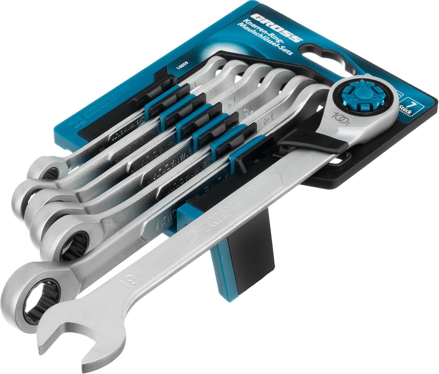 GROSS Набор ключей комбинированных трещоточных, количество зубьев 100, СRV, 7 шт, 8-19 мм 14859