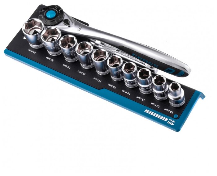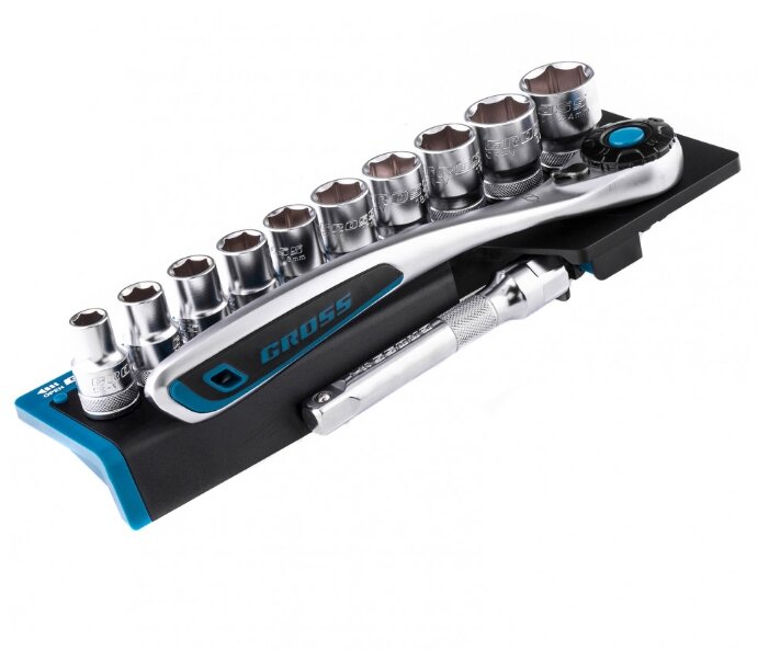 Наборы инструмента GROSS разработаны специально для автолюбителей и центров технического обслуживания. Головки и комбинированные ключи изготовлены из хромованадиевой стали, придающей инструменту исключительную твердость в сочетании с легкостью. Набор комплектуется трещотками с реверсом и быстрым сбросом, трещоточный механизм имеет 120 зуба и обеспечивает исключительную мягкость и плавность в работе. Шаг зуба 3 град. Все наборы упакованы в кейс. Наборы инструмента GROSS пригодятся вам не только в автомобиле. С их помощью можно проводить бытовой ремонт дома и на даче, ремонт бытовых конструкций и садовой техники. Набор предназначен для слесарно-монтажных работ. Состав набора: Ключ трещоточный 1/2" Удлинитель 100 мм 1/2" Головки торцевые 1/2": 10, 12, 13, 14, 16, 17, 18, 19, 22, 24 мм