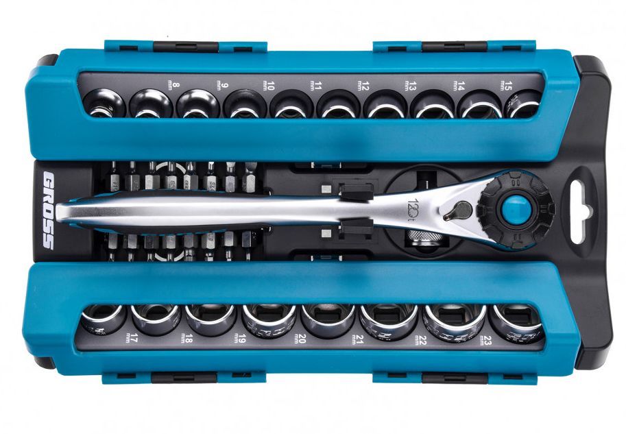 Наборы инструмента GROSS разработаны специально для автолюбителей и центров технического обслуживания. Головки и комбинированные ключи изготовлены из хромованадиевой стали, придающей инструменту исключительную твердость в сочетании с легкостью. Биты, биты-вставки и отвертки производятся из стали S2, улучшающей свойства инструмента. Набор комплектуется трещотками с реверсом и быстрым сбросом, трещоточный механизм имеет 120 зуба и обеспечивает исключительную мягкость и плавность в работе. Шаг зуба 3 град. Все наборы упакованы в кейс. Наборы инструмента GROSS пригодятся вам не только в автомобиле. С их помощью можно проводить бытовой ремонт дома и на даче, ремонт бытовых конструкций и садовой техники. Набор предназначен для слесарно-монтажных работ. Состав набора: Ключ трещоточный 1/2" Переходник 1/2" – 1/4" Адаптер для бит 5/16" - 1/2" Головки торцевые 1/2": 8, 9,10, 11, 12, 13, 14, 15, 16, 17, 18, 19, 20, 21, 22, 23, 24 мм Биты 5/16": PH1, PH2, PZ1, PZ2, SL4, SL5.5, SL7, H3, H4, H5, H6,