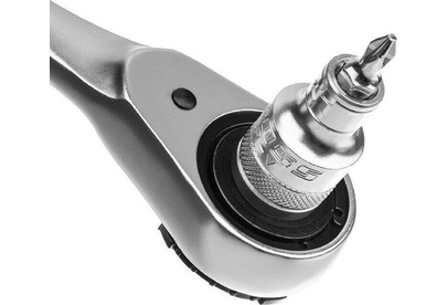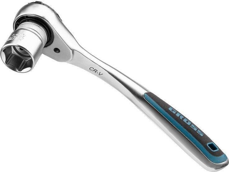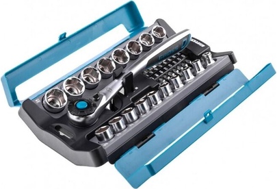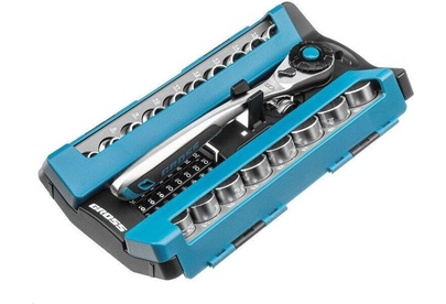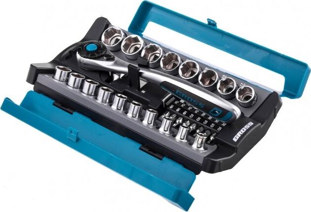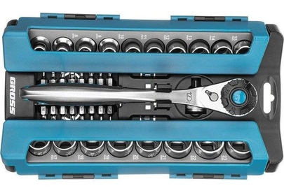 Наборы инструмента GROSS разработаны специально для автолюбителей и центров технического обслуживания. Головки и комбинированные ключи изготовлены из хромованадиевой стали, придающей инструменту исключительную твердость в сочетании с легкостью. Биты, биты-вставки и отвертки производятся из стали S2, улучшающей свойства инструмента. Набор комплектуется трещотками с реверсом и быстрым сбросом, трещоточный механизм имеет 120 зуба и обеспечивает исключительную мягкость и плавность в работе. Шаг зуба 3 град. Все наборы упакованы в кейс. Наборы инструмента GROSS пригодятся вам не только в автомобиле. С их помощью можно проводить бытовой ремонт дома и на даче, ремонт бытовых конструкций и садовой техники. Набор предназначен для слесарно-монтажных работ. Состав набора: Ключ трещоточный 1/2" Переходник 1/2" – 1/4" Адаптер для бит 5/16" - 1/2" Головки торцевые 1/2": 8, 9,10, 11, 12, 13, 14, 15, 16, 17, 18, 19, 20, 21, 22, 23, 24 мм Биты 5/16": PH1, PH2, PZ1, PZ2, SL4, SL5.5, SL7, H3, H4, H5, H6,