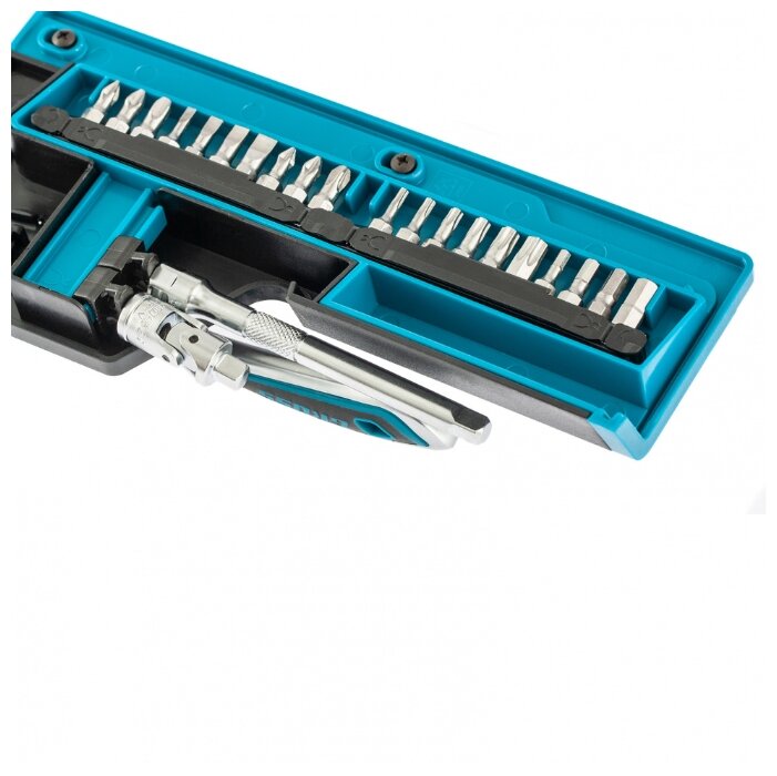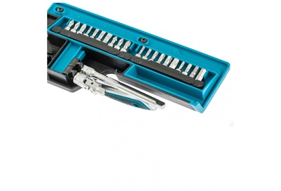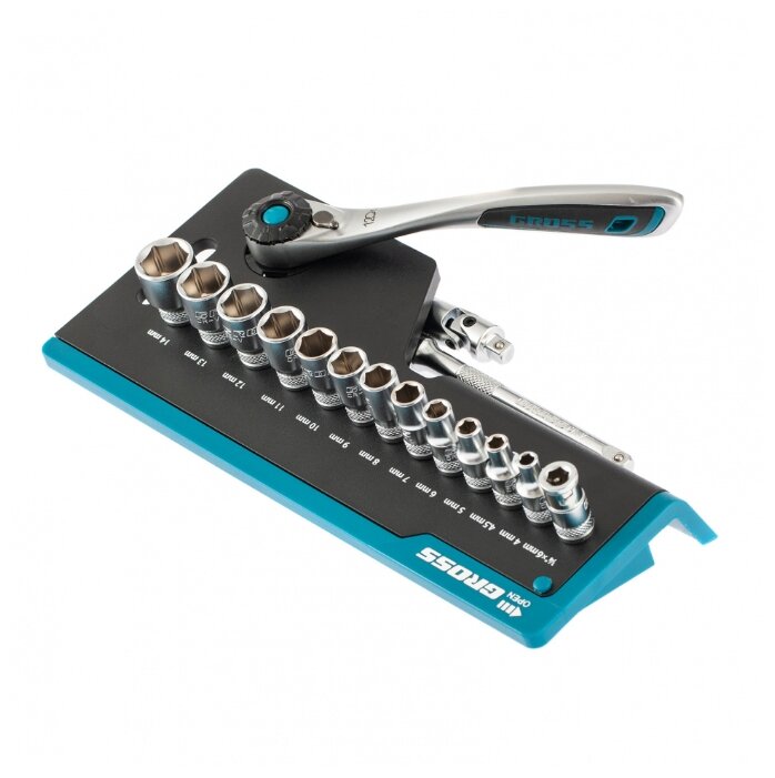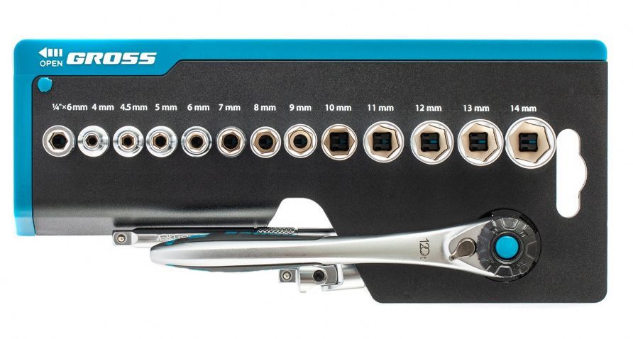 Наборы инструмента GROSS разработаны специально для автолюбителей и центров технического обслуживания. Головки и комбинированные ключи изготовлены из хромованадиевой стали, придающей инструменту исключительную твердость в сочетании с легкостью. Набор комплектуется трещотками с реверсом и быстрым сбросом, трещоточный механизм имеет 120 зуба и обеспечивает исключительную мягкость и плавность в работе. Шаг зуба 3 град. Все наборы упакованы в кейс. Наборы инструмента GROSS пригодятся вам не только в автомобиле. С их помощью можно проводить бытовой ремонт дома и на даче, ремонт бытовых конструкций и садовой техники. Набор предназначен для слесарно-монтажных работ. Состав набора: Ключ трещоточный 1/4" Удлинитель 100 мм 1/4" Головки торцевые 1 /4": 4, 4.5, 5, 6, 7, 8, 9, 10, 11, 12, 13, 14 мм Адаптер для бит 1/4" Шарнир карданный 1/4" Биты 1/4": PH1, PH2, PH3, PZ1, PZ2, SL4, SL5.5, SL7, H3, H4, H5, H6, H7, H8, T8, T10, T15, T20, T25, T30.