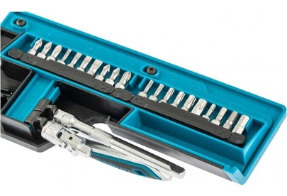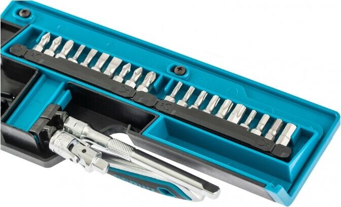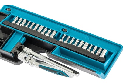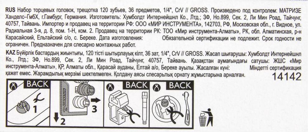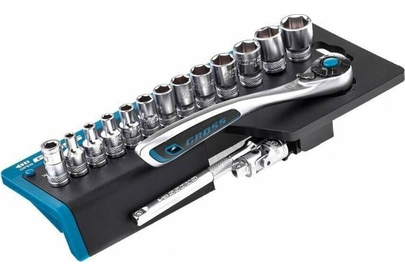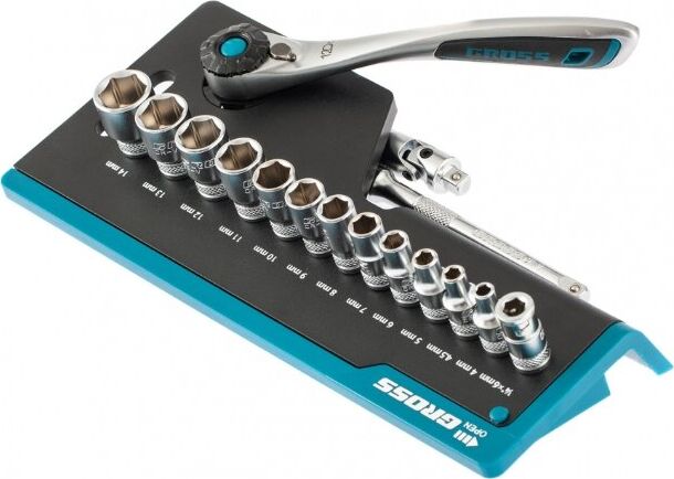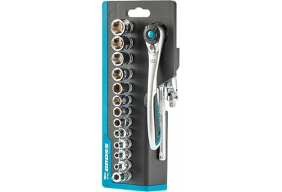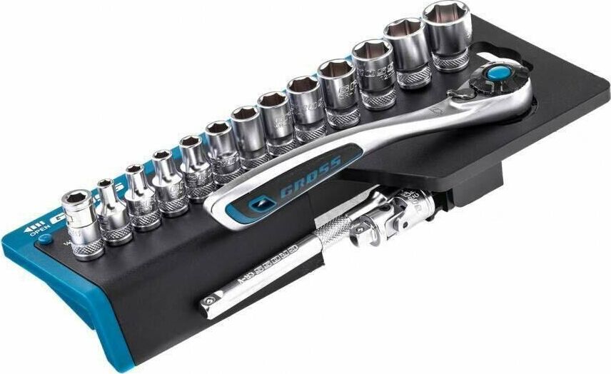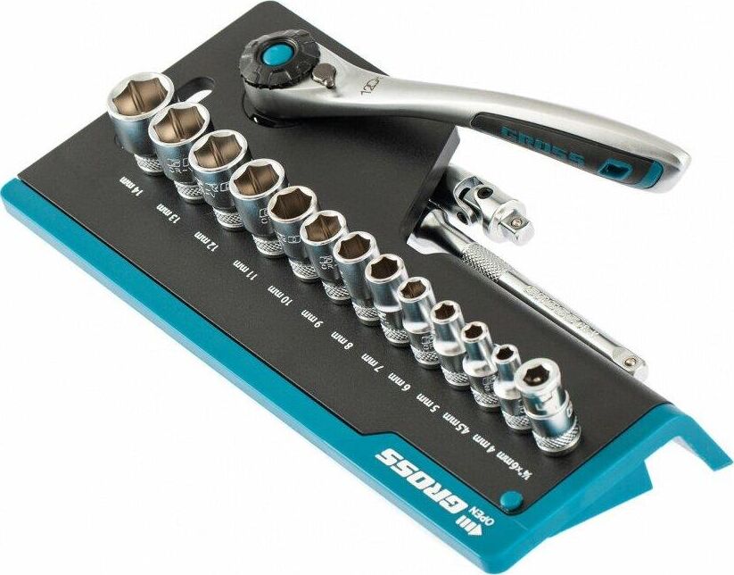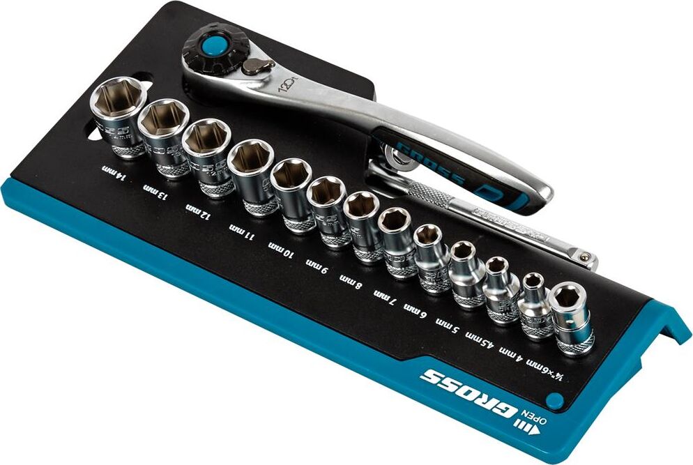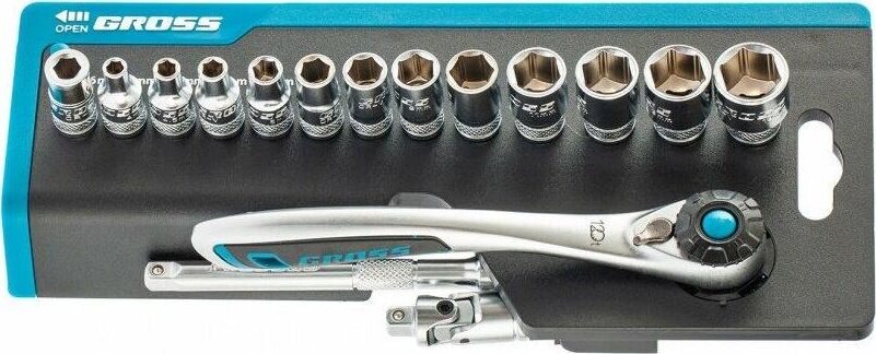Наборы инструмента GROSS разработаны специально для автолюбителей и центров технического обслуживания. Головки и комбинированные ключи изготовлены из хромованадиевой стали, придающей инструменту исключительную твердость в сочетании с легкостью. Набор комплектуется трещотками с реверсом и быстрым сбросом, трещоточный механизм имеет 120 зуба и обеспечивает исключительную мягкость и плавность в работе. Шаг зуба 3 град. Все наборы упакованы в кейс. Наборы инструмента GROSS пригодятся вам не только в автомобиле. С их помощью можно проводить бытовой ремонт дома и на даче, ремонт бытовых конструкций и садовой техники. Набор предназначен для слесарно-монтажных работ. Состав набора: Ключ трещоточный 1/4" Удлинитель 100 мм 1/4" Головки торцевые 1 /4": 4, 4.5, 5, 6, 7, 8, 9, 10, 11, 12, 13, 14 мм Адаптер для бит 1/4" Шарнир карданный 1/4" Биты 1/4": PH1, PH2, PH3, PZ1, PZ2, SL4, SL5.5, SL7, H3, H4, H5, H6, H7, H8, T8, T10, T15, T20, T25, T30.