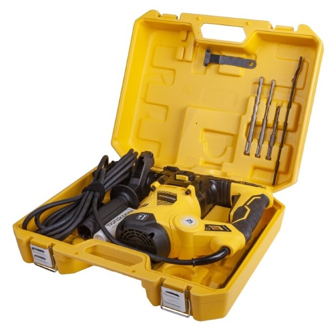 Максимальная мощность (Вт) 1 500, Обороты на холостом ходу (об/мин) 0-850, Количество режимов работы 3, Энергия удара (Дж) 5, Защитная муфта, Диаметр сверления (металл/дерево/бетон) (мм) 13/40/32, Вес 7.75 кг, Напряжение питания (В) 220, Тип крепления оснастки SDS-plus, Вид упаковки-пластиковый кейс.