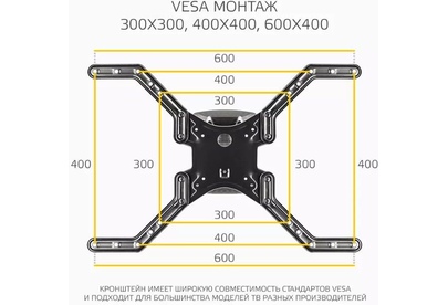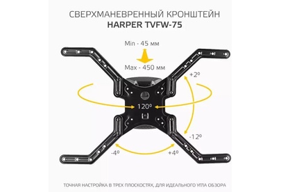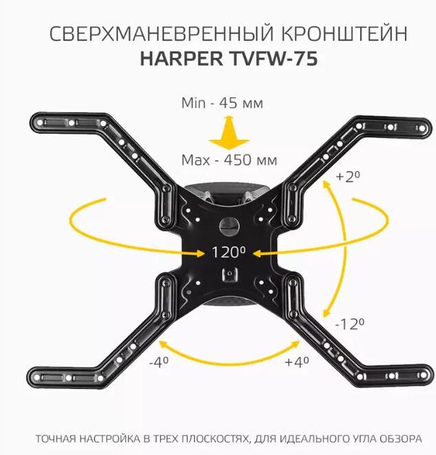 Наклонно-поворотный подвес для телевизоров HARPER TVFW-75. Назначение: для LCD- и LED-телевизоров; Тип кронштейна: наклонно-поворотный; Совместимость: поддерживает ТВ с диагональю 32-75; Максимальный вес ТВ: 40 кг.; Крепление стандарта Vesa: до 600х400; Типы VESA: 100x100/200x100/200x200/300x300/400x400/600x400; Угол наклона: -12°+2°; Масштабирование по горизонтали: да; Масштабирование по вертикали: да; Материал корпуса: сталь, пластик; Цвет: черный; Вес: 3.4 кг.; Размеры (ШхВхГ): 635x345x450 мм.; Минимальное расстояние от стены: 45 мм.; Максимальное расстояние от стены: 450 мм.; Гарантия: 12 мес.; Страна производитель: Китай; Комплектация: Кронштейн, крепежные детали, инструкция, гарантийный талон.