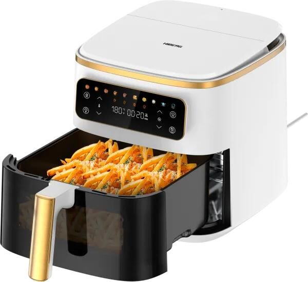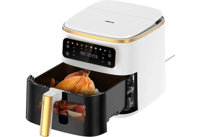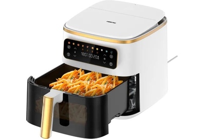 Аэрогриль с пароваркой, Объем: 7 л, Управление: сенсорное, 10 автоматических программ, приготовление на пару, Подсветка содержимого чаши , Антипригарное керамическое покрытие чаши, Резервуар: 1,1 л. Мощность: 1700 Вт. Цвет-Белый с золотом
