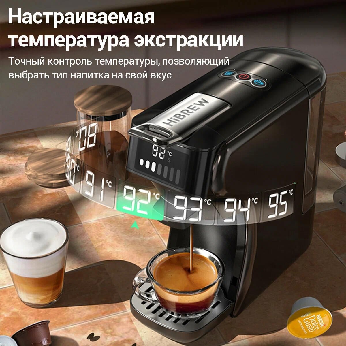 крепость кофе, объем порции горячей воды, температура кофе