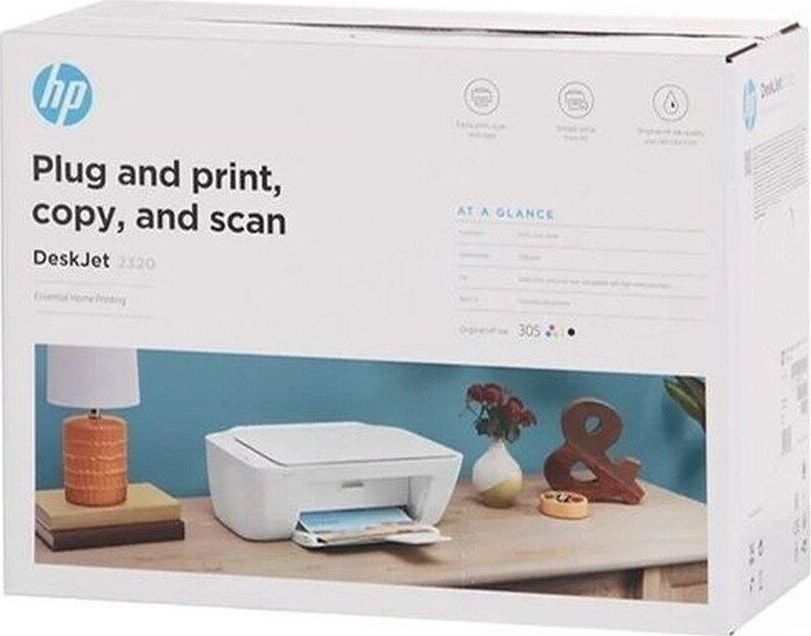 МФУ HP DeskJet 2320,< br> HP 305, стартовый картридж, черный,< br> HP 305, стартовый картридж, трехцветный,< br> листовка с нормативными требованиями,< br> руководство по установке,< br> справочное руководство,< br> кабель питания.