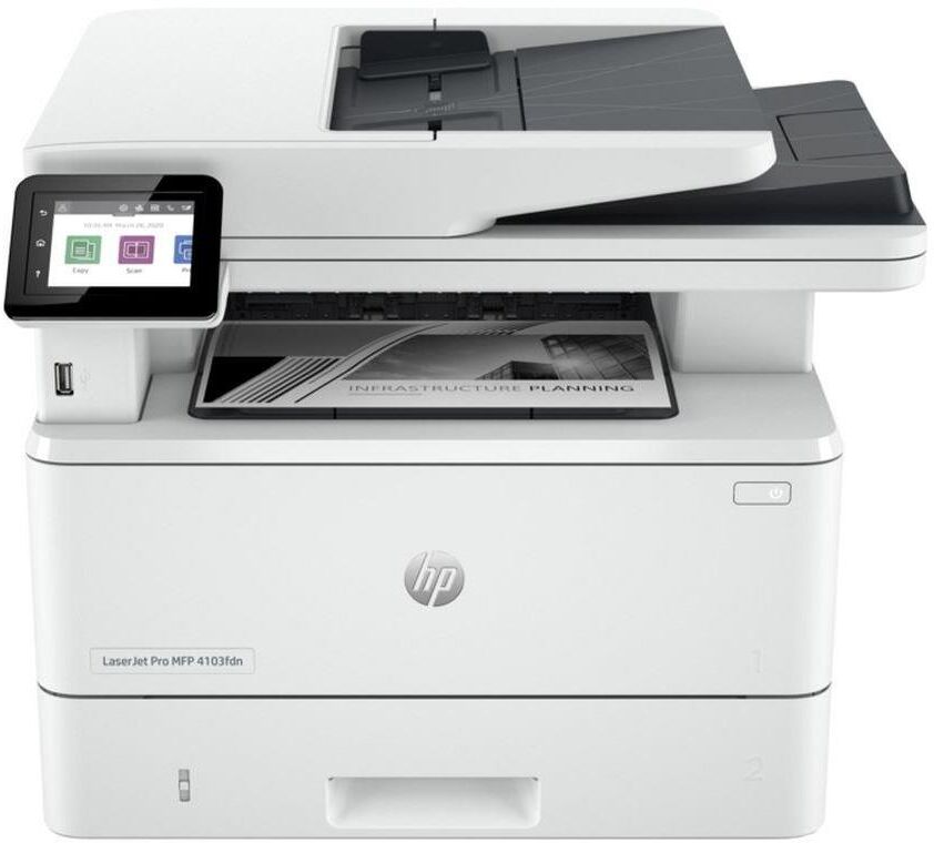 МФУ HP LaserJet Pro MFP M4103fdw 2Z629A (A4, Printer/Scanner/Copier/ADF/Fax, 1200 dpi, 38 ppm, 512 Mb, 1200 MHz, tray 100+250 pages, USB+Ethernet+WiFi, Duplex, месячная нагрузка 80K pages, стартовый картридж 3К)