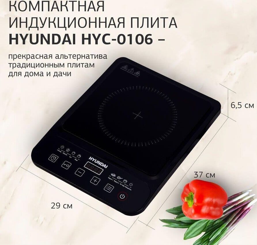 Мощность 1400 Вт; 4-рязрядный цифровой светодиодный дисплей; 8 уровней мощности / 8 температурных режимов; Таймер до 3 часов, Автоматическое отключение; Защита от перегрева; Сенсорный тип управления; Цвет: черный, размеры нетто 290x370x65мм, длина кабеля питания 1,2 м; ножки с нескользящей опорой, цвет черный