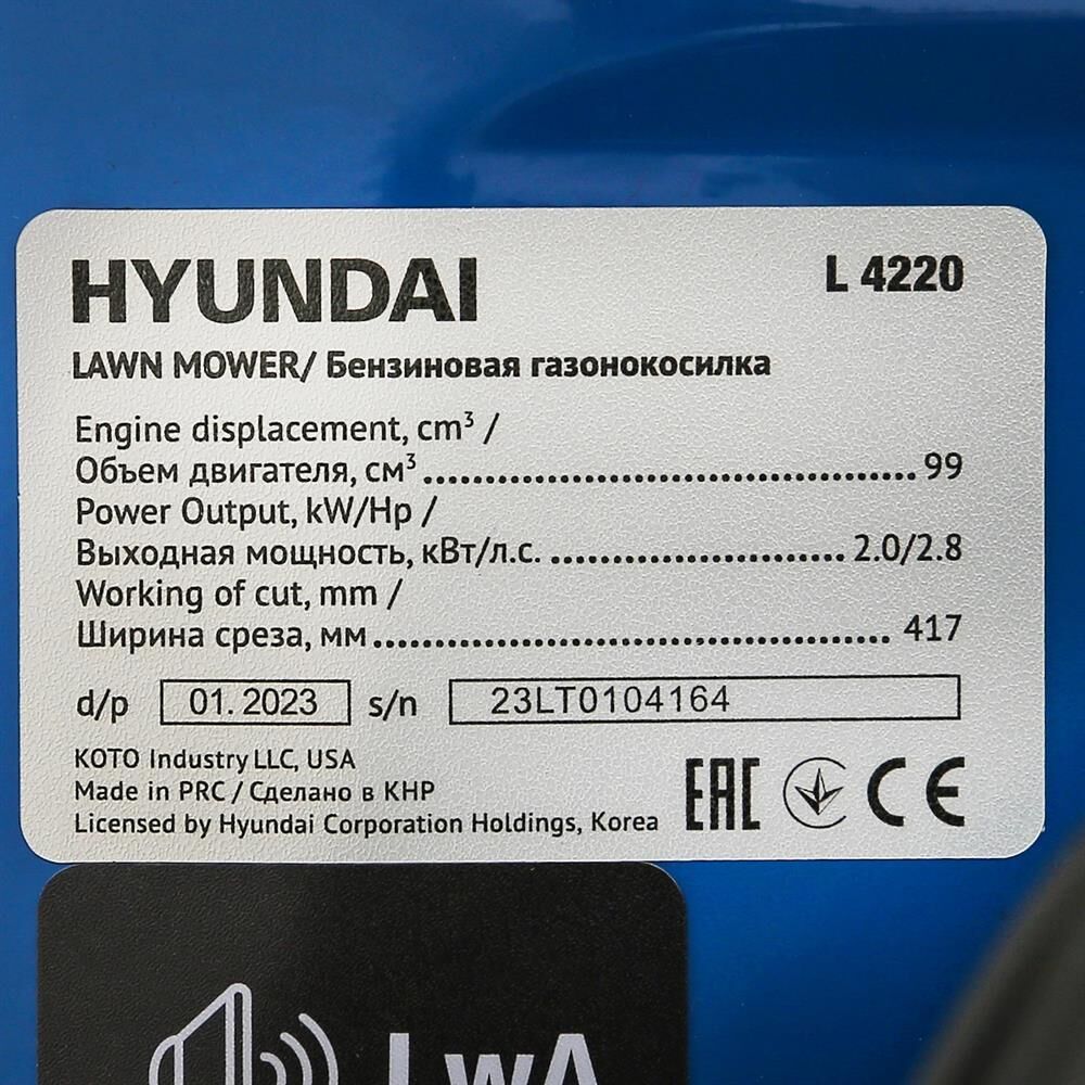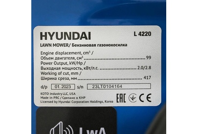 Выходная мощность, л.с. 2.8. Количество лопастей режущего ножа 2. Мульчирование Да. Ширина среза, см 41,7. Высота среза максимальная, мм 70. Наличие привода движения нет. Модель двигателя Hyundai ICV100. Регулировка высоты кошения Центральная. Материал корпуса Сталь. Объем травосборника, л 45. Вес, кг 19. Боковой выброс нет. Высота среза минимальная, мм 20. Уровень звуковой мощности, дБ (А) Lwa 96. Объем двигателя, см3 99.8. Емкость топливного бака, л 0.9. Диаметр колес передние/задние (мм) 152.4/177.8. Тип перемещения – самоходная (или не самоходная) нет. Объем картера, л 0.5.