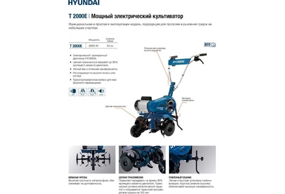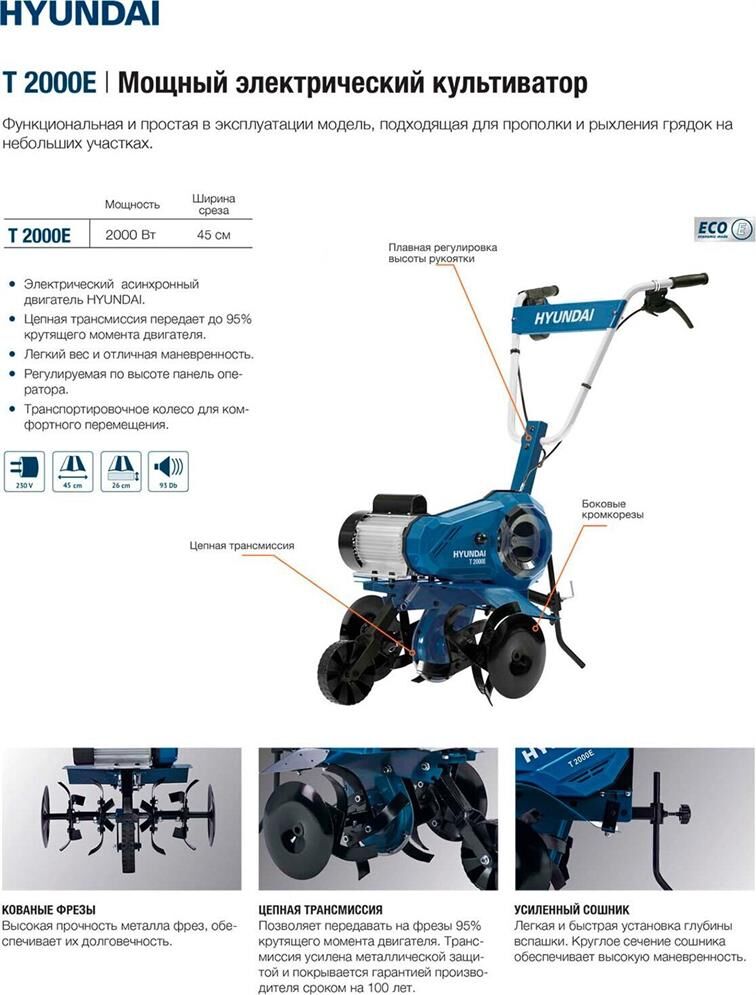 Количество скоростей 1 вперед. Охлаждение воздушное. Редуктор цепной. Фреза кованная сталь саблевидной формы. Характеристики двигателя асинхронный двигатель Hyundai. Тип двигателя Электрический. Мощность, Вт 2000. Напряжение, В 230. Частота, Гц 50. Рабочая ширина, см 45. Шкив / Вал отбора мощности Отсутствует. Рабочая глубина, см 26. Диаметр фрез, см 28. Уровень шума, Дб 82. Вес, кг 29.8.