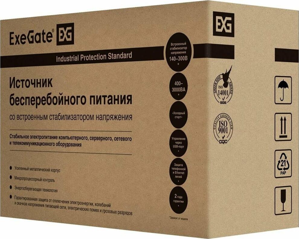 ИБП серии Power Back BNB, являются линейно-интерактивными, оснащены встроенным устройством автоматического регулирования напряжения (AVR); полная мощность, ВА - 400, батарея - ExeGate HR 12-4,5 (12V/4,5Ач), номинальное напряжение, В- 230, диапазон напряжений, В - 140-300, частота, Гц - 50/60±5, защита и фильтрация от высоковольтных выбросов, электромагнитных и радиочастотных помех, понижения, повышения и полного исчезновения напряжения в электросети.