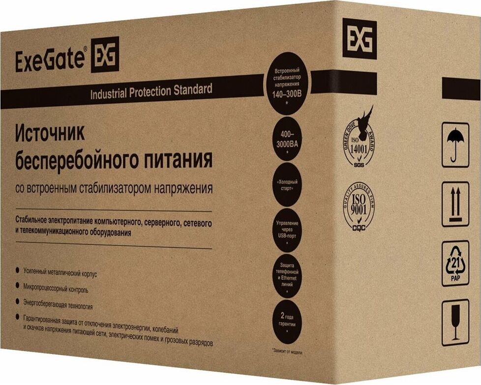 ИБП серии SpecialPro UNB, предназначены, помимо использования в обычных офисных условиях, так же и для использования в неблагоприятных условиях, в промышленных и производственных помещениях; полная мощность, ВА - 600, батарея - ExeGate HR 12-7.2 (12V/7,2Ач), номинальное напряжение, В- 230, диапазон напряжений, В - 140-300, частота, Гц - 50/60±5, защита и фильтрация от сетевых высокочастотных, низкочастотных и импульсных помех, от короткого замыкания, перегрузки, перезаряда и глубокого разряда.