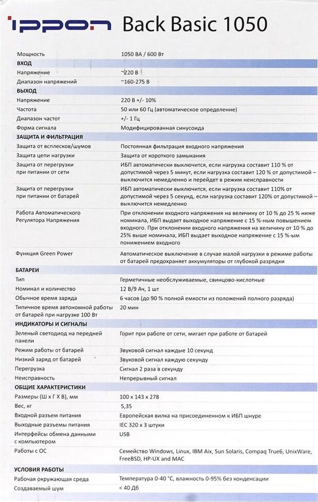 ИБП IPPON BACK BASIC 1050 (600Вт/1050ВА)